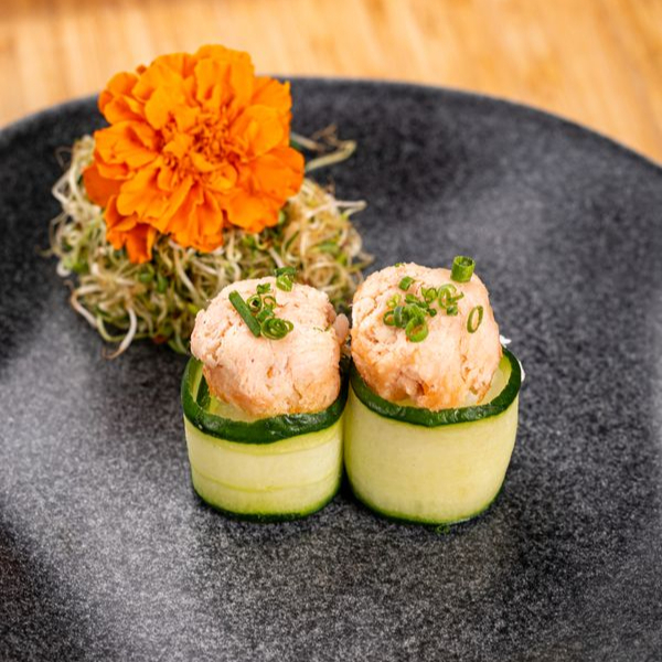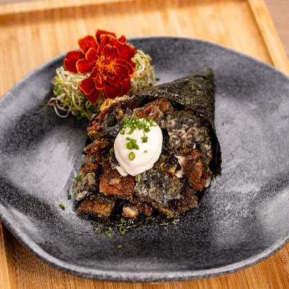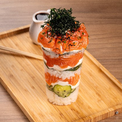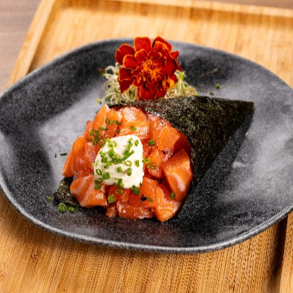 Recheado com salmão fresco, cream cheese, sunomono, e servido em uma apresentação inovadora, combina a crocância da alga nori com uma mistura cremosa e irresistível. Uma experiência deliciosa e surpreendente!