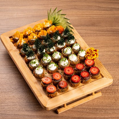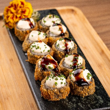 Rolo Empanado e Dourado, Feito com Arroz Japonês e Alga Nori. Após Frito, é Finalizado com Cream Cheese e Camarões Grelhados, Garantindo Sabor Intenso, Textura Crocante e Um Recheio Suculento. Finalizado com Cebolinha.