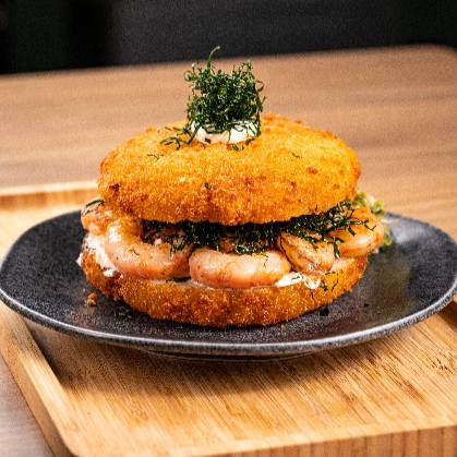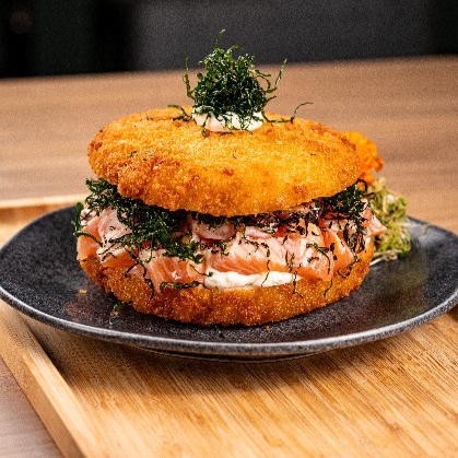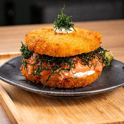 Burger de Arroz Japonês Empanado e Dourado, Recheado com Salmão Fresco, Cream Cheese e Couve Crispy. Uma Combinação Equilibrada Entre Cremosidade, Crocância e o Sabor Marcante do Salmão.