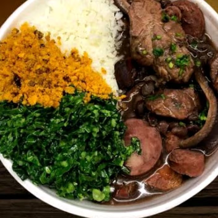 Acompanha Arroz, Feijão preto,torresmo, vinagrete, farofa e couve. Vem tudo separado cada um na sua embalagem.