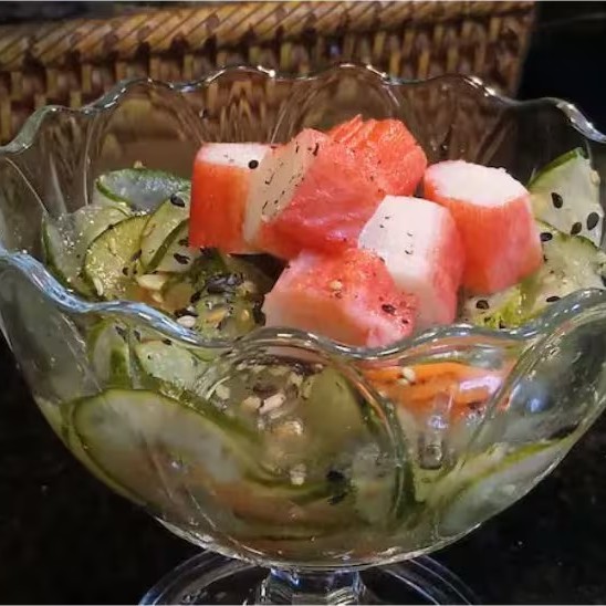 (salada de pepino com cenoura ao molho agridoce e kani)