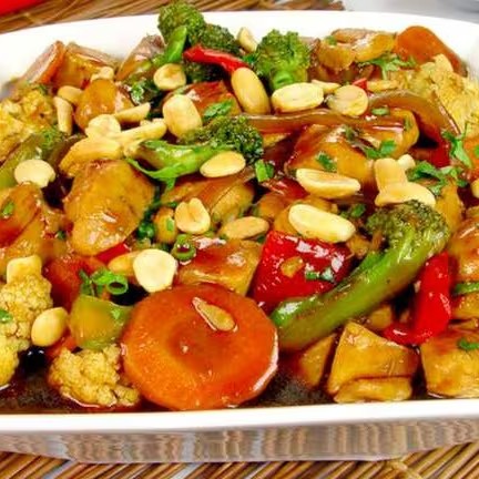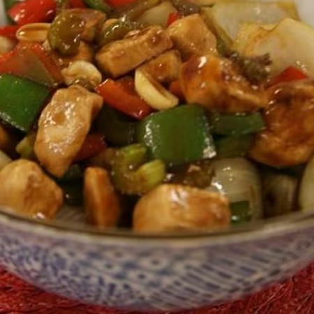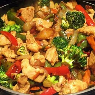 (Frango em cubos, pimentão, cenoura, cebola, com molho shoyu)