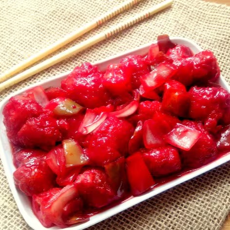(Frango fatiado, cebola, cenoura, e couve-flor com molho levemente picante.)