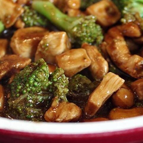 (Frango, brócolis, pimentão fatiado e champignon com molho shoyu.)