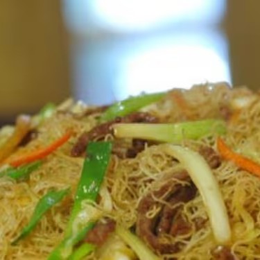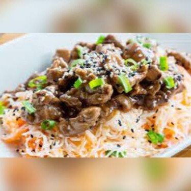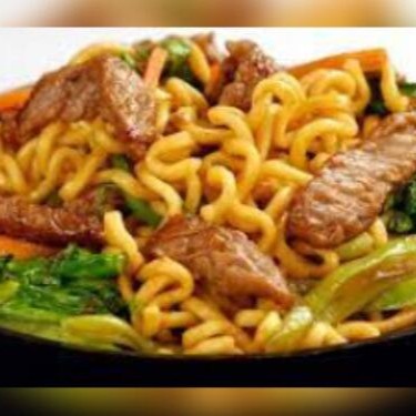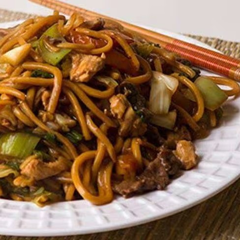 (Macarrão chinês preparado com pedaços de carne bovina e peito de frango, acelga, couve-flor, cenoura, brócolis, cogumelos, temperados com delicioso molho de soja.)