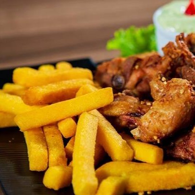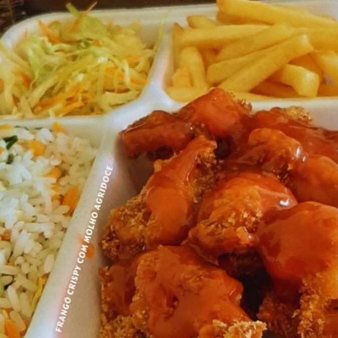 (Frango a passarinho desossado, arroz yakimesh, fritas e salada do Dia.)