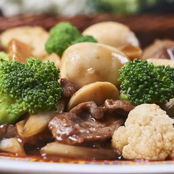 (Carne, brocólis, pimentão fatiado e champginon com molho shoyu.)