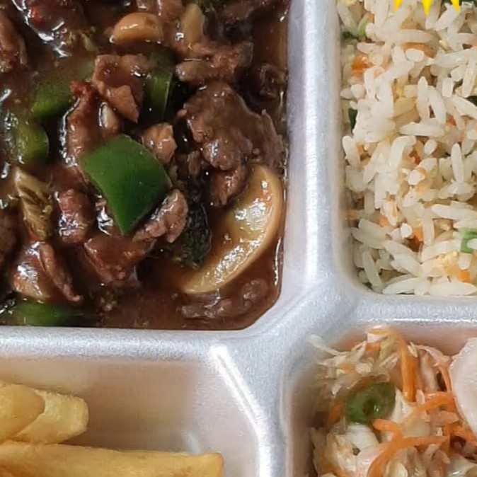 (Carne chop suey, arroz yakimesh, fritas e salada do Dia.)