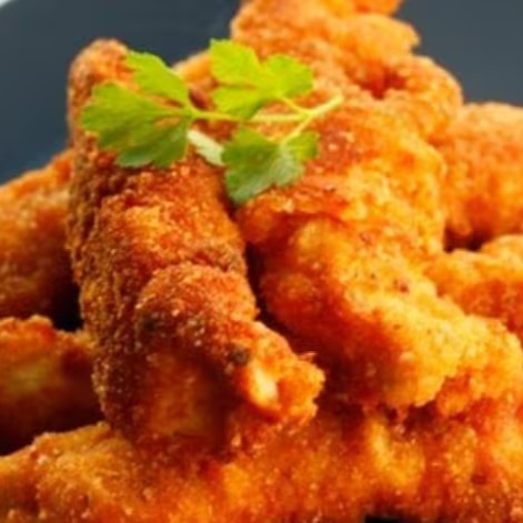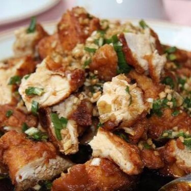 (Frango empanado com massa leve, salpicada com alho e cebolinha)