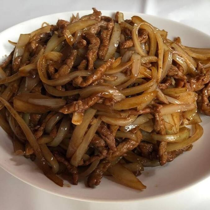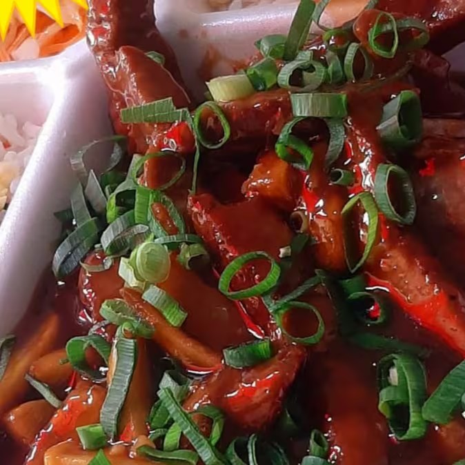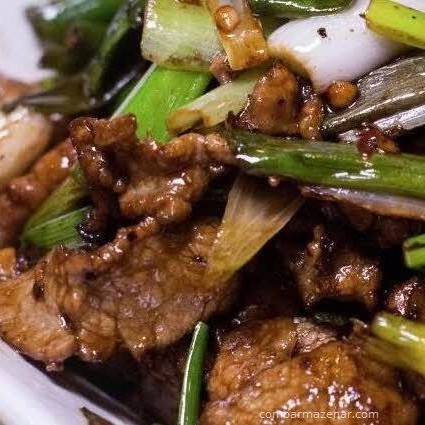 (Carne desfiada com cebola e pimentão com molho shoyu.)