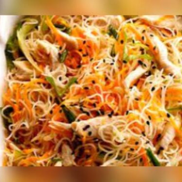 (Macarrão chines com frango, acelga, brócolis, couve-flor, cenoura, cogumelo, temperado ao molho de soja.)