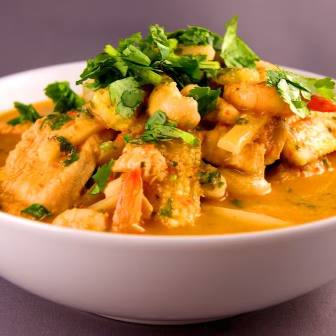 (Carne, couve-flor, cebola, cenoura com molho levemente picante.)