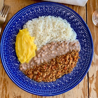 250g - Acompanha arroz branco, feijão, purê de cabotiá, beterraba cozida e ervilhas.