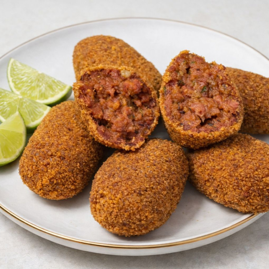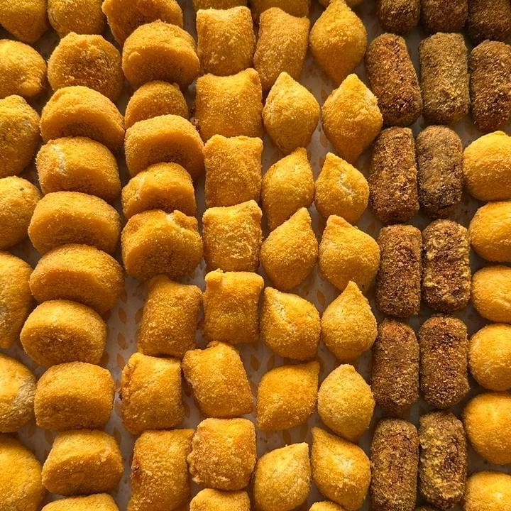 Croquete feito com mortadela defumada moída selecionada e temperado com especiarias, pesa aproximadamente 20 gr.peciarias