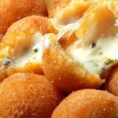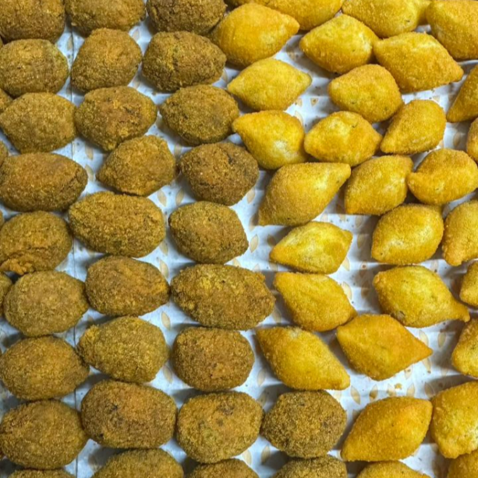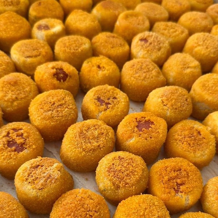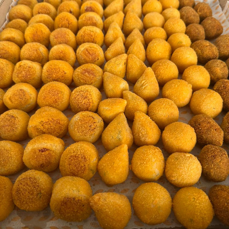 Deliciosa bolinha recheada com queijo mussarela e temperada com um toque de orégano, pesa aproximadamente 20 gr.