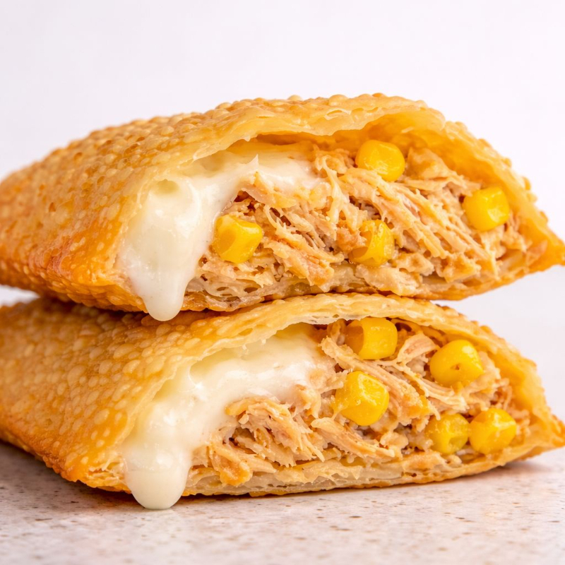 Delicioso pastel de frango desfiado e temperado com requeijão cremoso e milho verde.