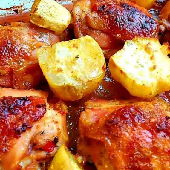 Frango assado no ponto certo — dourado por fora, suculento por dentro — servido com batatas assadas bem temperadas e aquele sabor caseiro irresistível. Acompanha arroz branco, feijão fresquinho e duas guarnições à sua escolha. Uma refeição completa, saborosa e feita com carinho, do jeitinho que todo almoço de domingo merece!