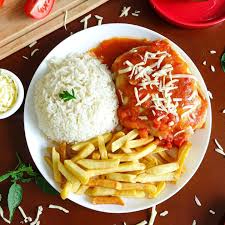 Um delicioso filé de frango á milanesa, coberto com um molho de tomate maravilhoso e queijo muçarela, acompanhado de um arroz soltinho e batata frita.