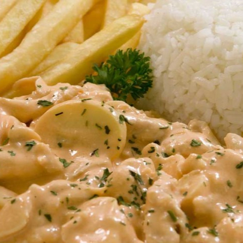 Um cremoso e saboroso strogonoff de frango feito com ingredientes de qualidade, acompanhado de arroz soltinho e batata frita
