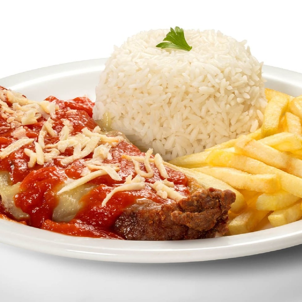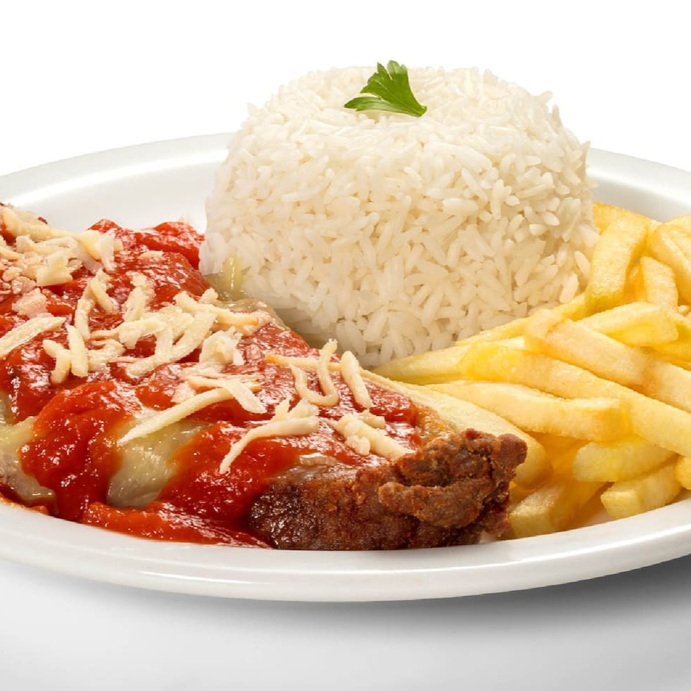 A Parmegiana de Frango que exala um aroma reconfortante e delicioso de frango frito, queijo derretido e molho de tomate. Esse prato acompanha Arroz, Feijão, Batata Frita e Farofa.