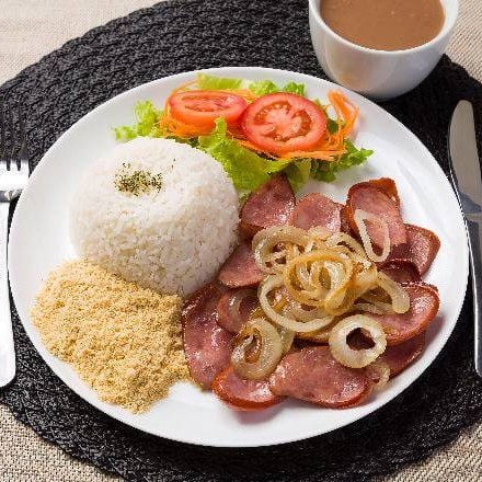 Deliciosa calabresa fatiada acebolada, Esse prato acompanha Arroz, Feijão, Batata Frita e Farofa.