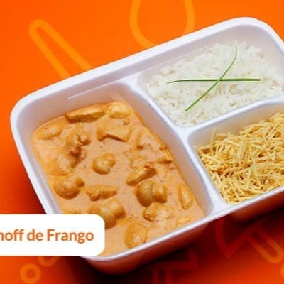 Acompanha arroz, um delicioso strogonoff de frango e batata palha. Servida na marmita retangular na divisória de 700 ml.