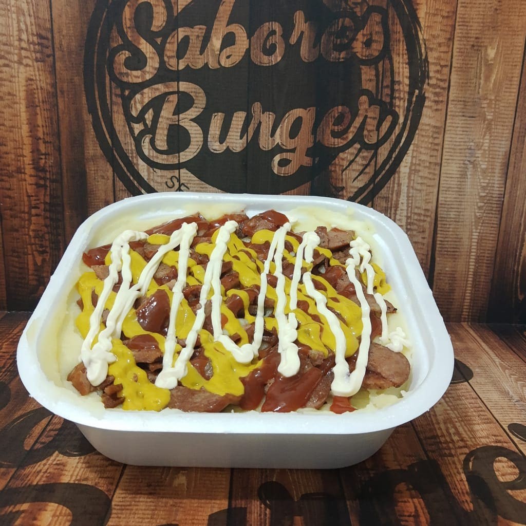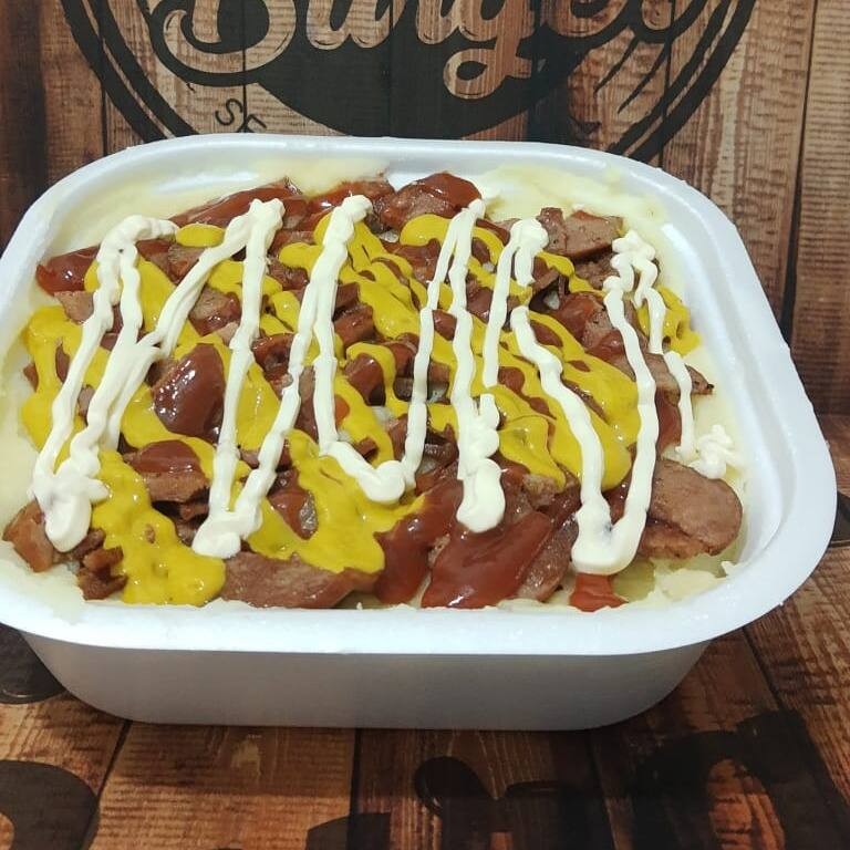 Purê caseiro, 2 salsicha, calabresa, presunto, queijo, milho, vinagrete, bacon, cheddar, Catupiry, mostarda, ketchup, maionese e palha.