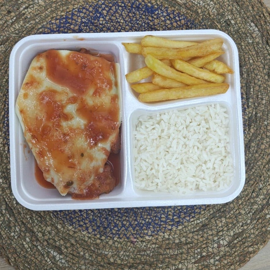 Marmita Mini Parmegiana De Frango + Fritas + Arroz Copiar