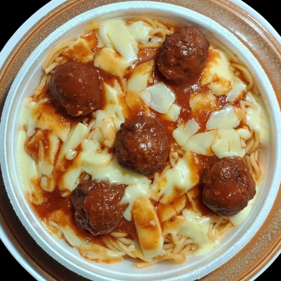 Marmita com um delicioso Espaguete ao molho sugo, coberto com queijo cremoso com almôndegas suculentas ( aprox. 530 gramas de pura delicia )