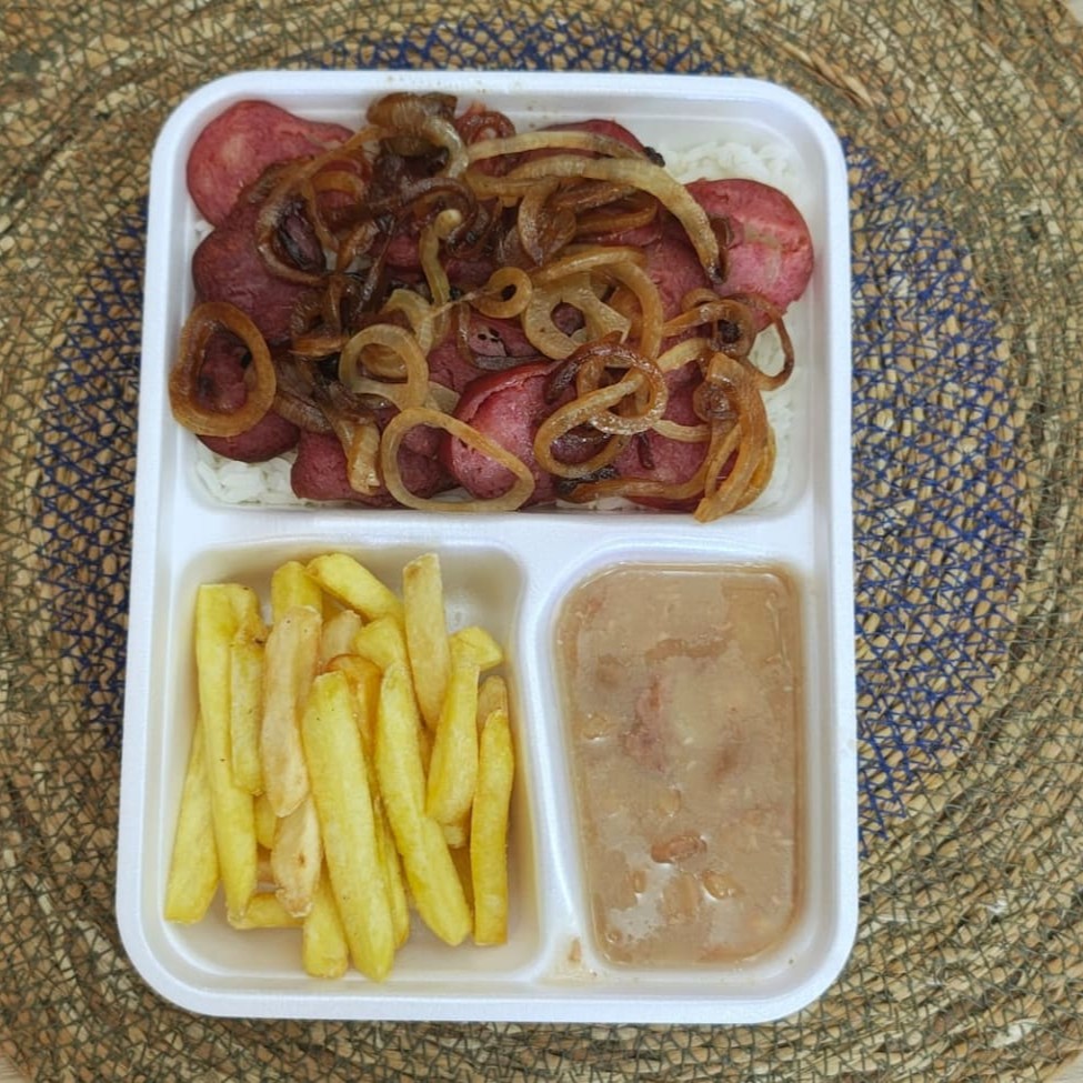 Marmita Mini Calabresa Acebolada + Arroz + Feijão + Batata Frita