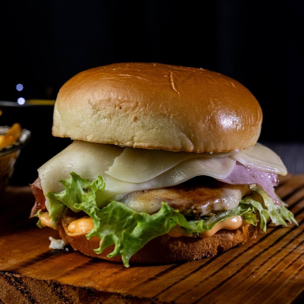 Pão Brioche, file de Frango, presunto, queijo cremoso, molho especial e salada