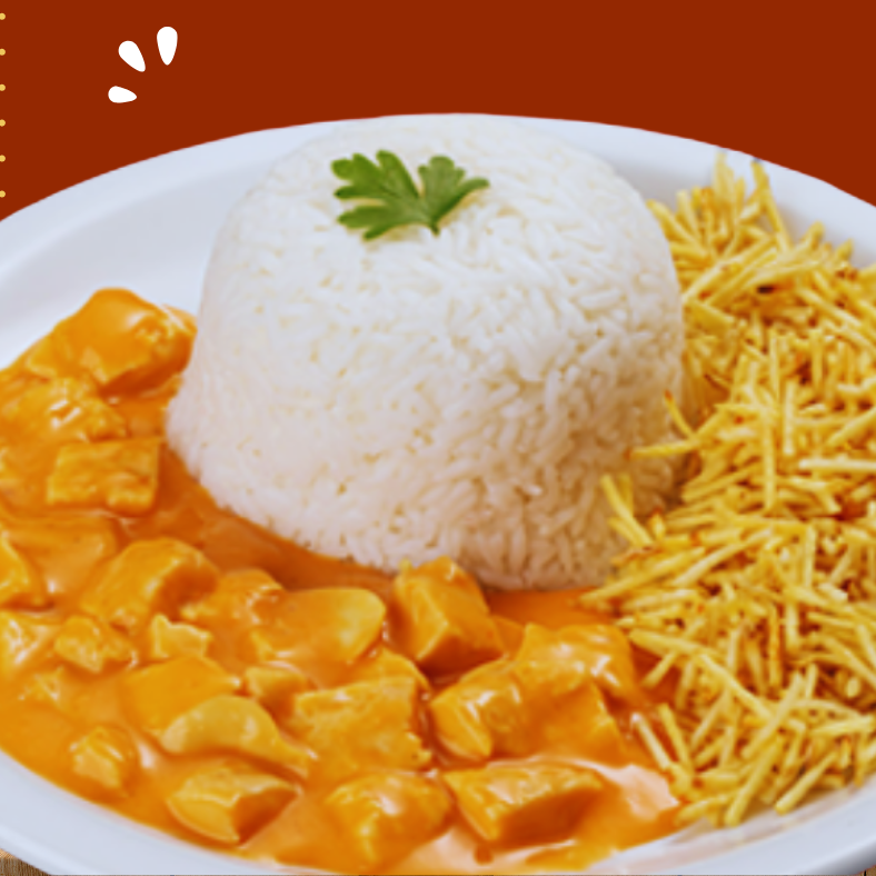 Strogonoff de frango finalizado com creme de leite, acompanha arroz, batata palha