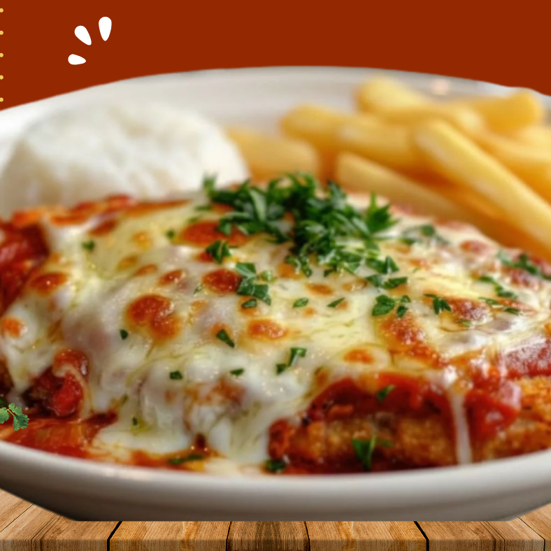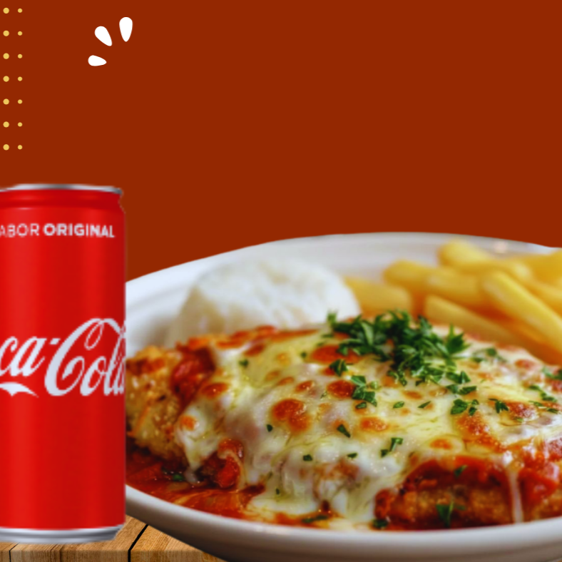 Experimente nosso delicioso parmegiana de frango com molho caseiro, acompanhado de arroz, fritas e um guaraná em lata