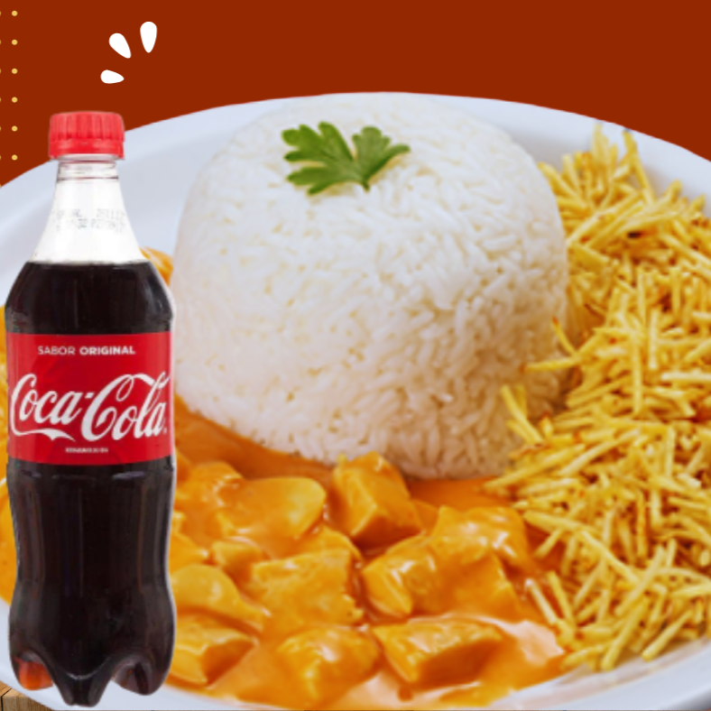 Delicioso strogonoff feito com requeijão, mostarda, creme de leite e ketchup, acompanha arroz, batata palha uma coca de 600