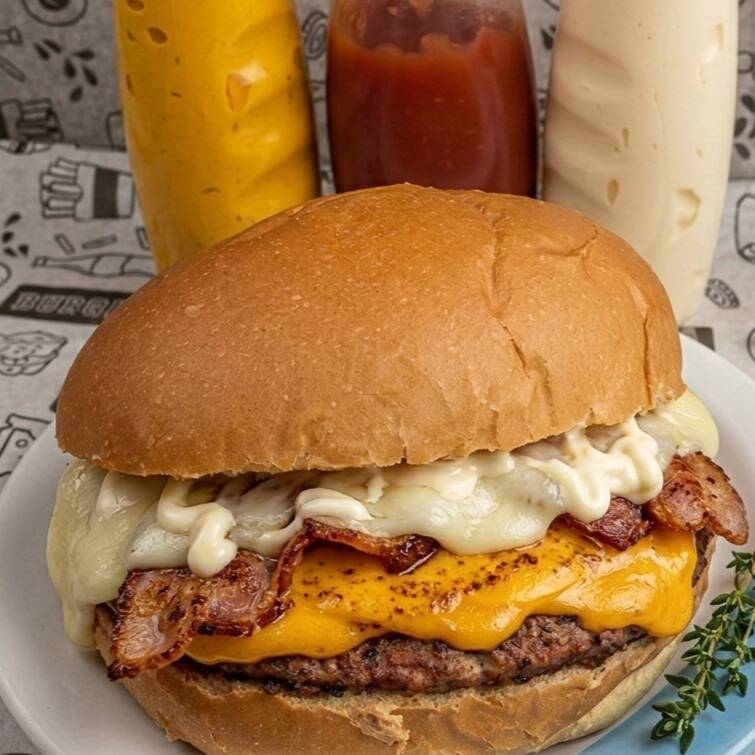 Pão, Hambúrguer, bacon, cheddar, queijo ,maionese