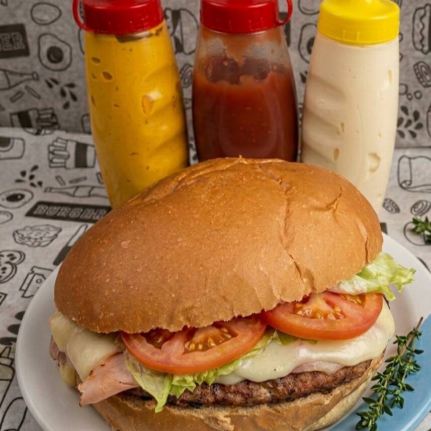 Pão ,hambúrguer, queijo, presunto, ketchup e maionese.