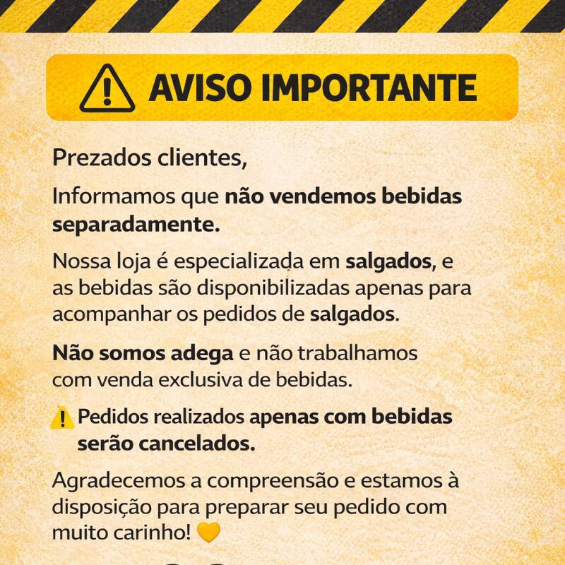 ⚠️ AVISO IMPORTANTE Prezados clientes, Informamos que não vendemos bebidas separadamente. Nossa loja é especializada em salgados, e as bebidas são disponibilizadas apenas para acompanhar os pedidos de salgados. Não somos adega e não trabalhamos com venda exclusiva de bebidas. Pedidos realizados apenas com bebidas serão cancelados. Agradecemos a compreensão e estamos à disposição para preparar seu pedido com muito carinho! 💛