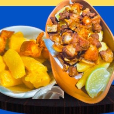 Saborosa panceta, acompanhada por mandioca fritas e molho da casa.