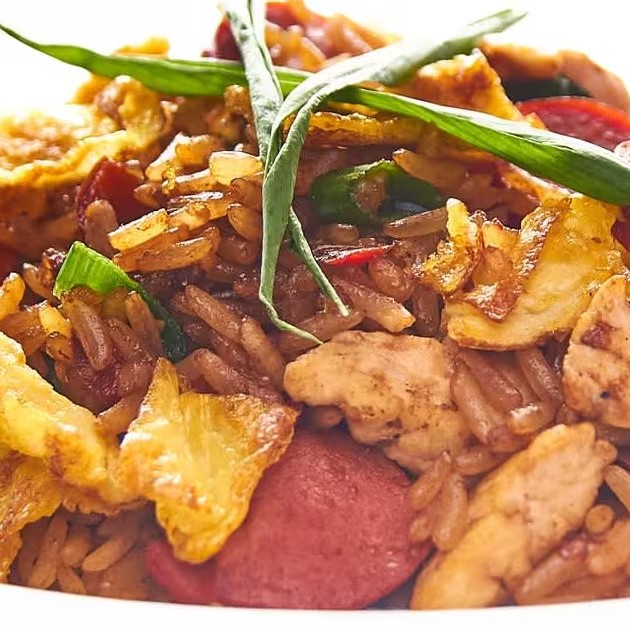 Delicioso chifa peruano. Na composição do prato tem-se arroz frito no óleo de gergelim com cubinhos de frango, omelete, cebolinha e shoyu. E um leve toque de gengibre. De todos os tamanhos e para todas as ocasiões.