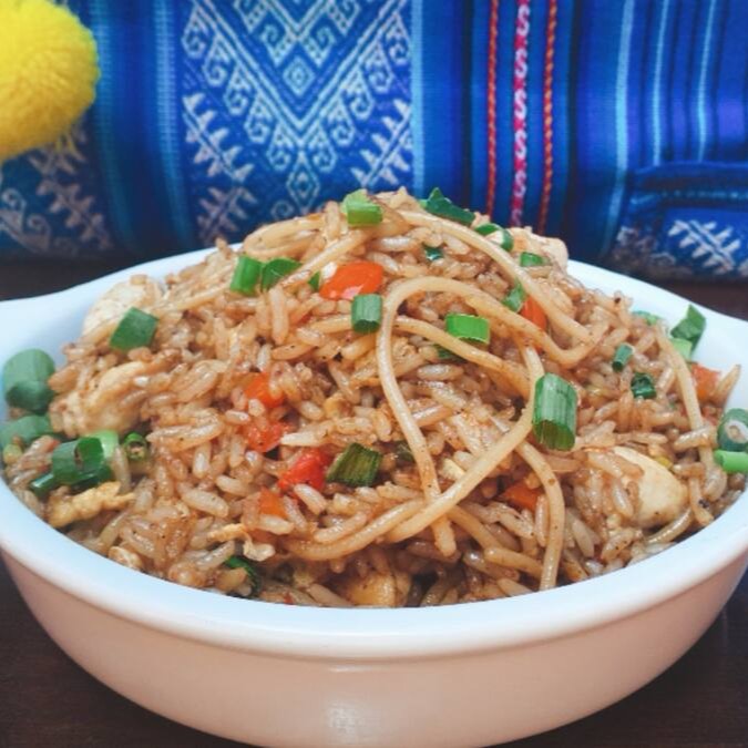 Delicioso chifa peruano. Na composição do prato tem-se arroz frito no óleo de gergelim com cubinhos de file mignon , salsichas picadinhas(opcional), omelete, cebolinha e shoyu. E um leve toque de gengibre. De todos os tamanhos e para todas as ocasiões.