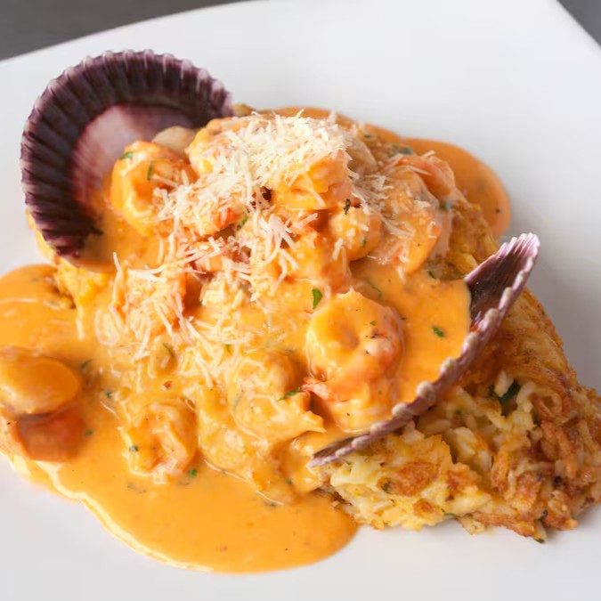 Deleitoso risoto a la huancaína a base de molho de queijo e aji amarillo,acompanha camarões , mexilhões e lula ao molho aji panca delicadamente apimentado.