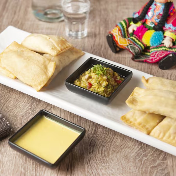 Mini pastéis dourados, recheados com queijo muçarela e o tradicional molho huancaína. Servidos com guacamole cremoso (à base de abacate). Uma entrada leve e saborosa, perfeita para compartilhar e saborear a autêntica fusão dos sabores peruanos.