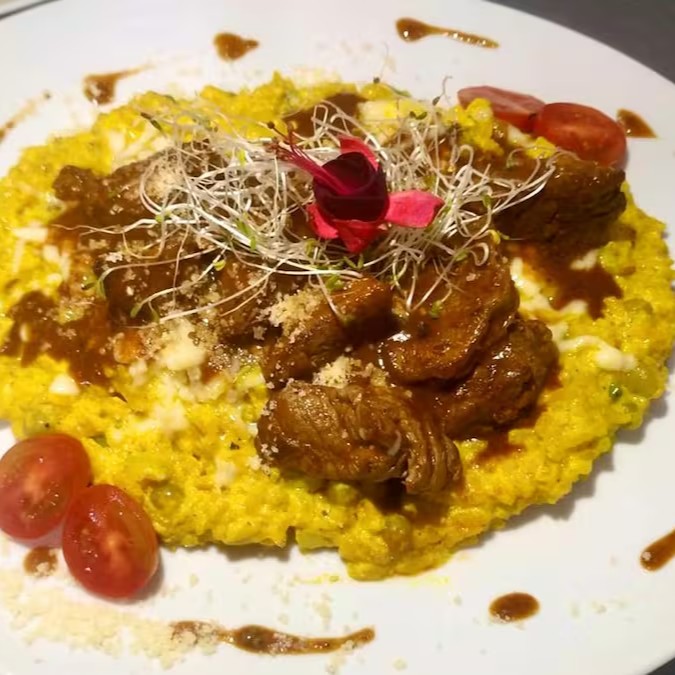 Deleitoso risoto a la huancaína a base de molho de queijo e aji amarillo,acompanha file mignon ao molho aji panca delicadamente apimentado.