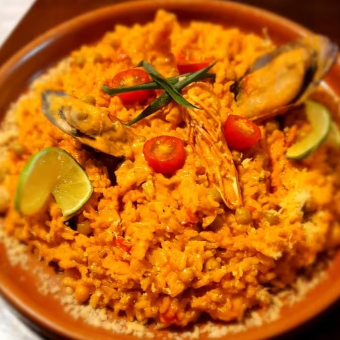 Saborosa paella peruana de camarões , mexilhões ,lula e langostim feita com molho "madre" da chef, especiarias aromáticas e pimentão.