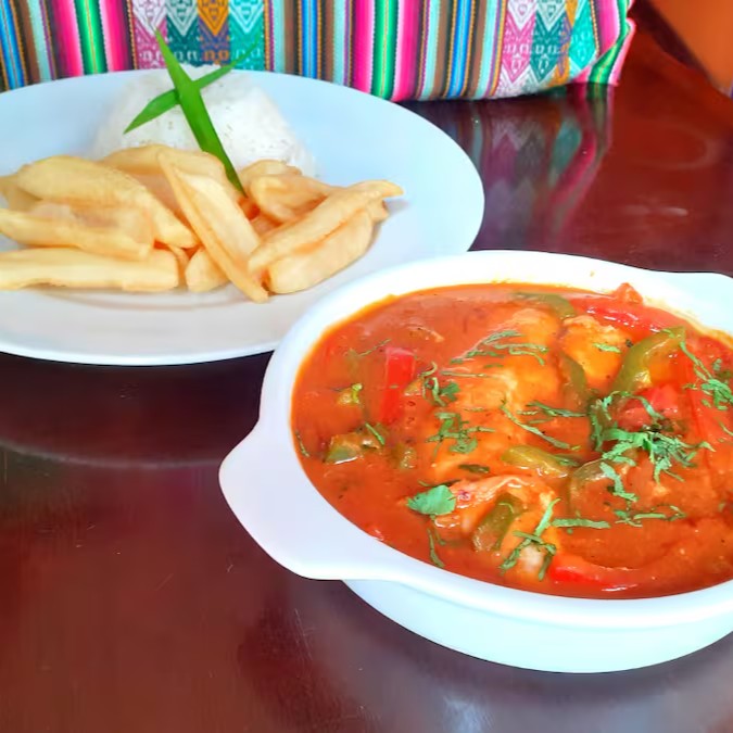 Combinaçao da famosa moqueca brasilera com o sudado peruano, fusão irresistivel com peixe St ´Peter .Acompanha fritas crocantes e arroz bem quentinho.