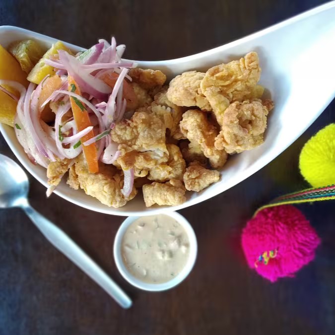 É um prato peruano de comida marinha e é um dos pratos mais pedidos pelas famílias peruanas crocantes iscas de peixe, camarões ,lula e mexilhaões empanada, com sabororsa salsa criolla ,acompanha mandioca frita e molho da casa.
