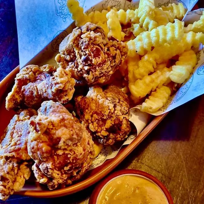 Frango frito com deliciosa casquinha crocante. Acompanha fritas e molho especial da casa.