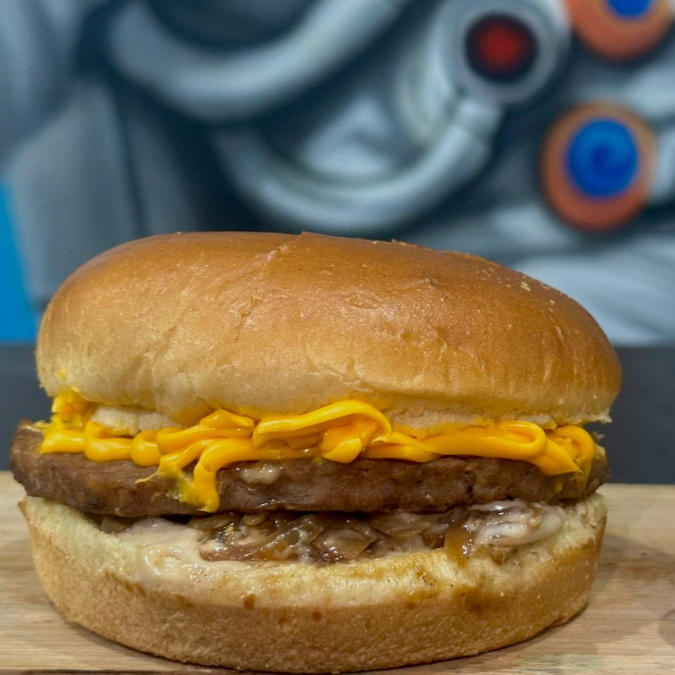 Pão brioche, molho tasty, 2 hambúrgueres 90g cada, queijo cheddar, cebola caramelizada e muito cheddar cremoso!