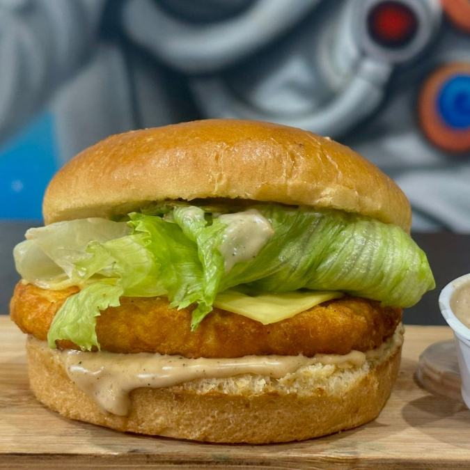 Pão com gergelin ,molho tasty,2 Frangos empanados 100g ,Empanado de Catupiry ,Mussarela,Bacon,Alface,Tomate,Cebola roxa