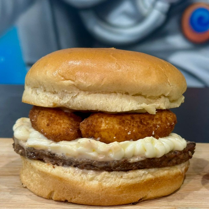 Pão brioche, molho tasty, 2 hambúrgueres 90g , 1 frango empanado , fatias de queijo mussarela e queijo cheddar, cebola caramelizada , Catupiry empanado crocante, anéis de cebolas empanados, bacon, alface, tomate e cebola roxa!